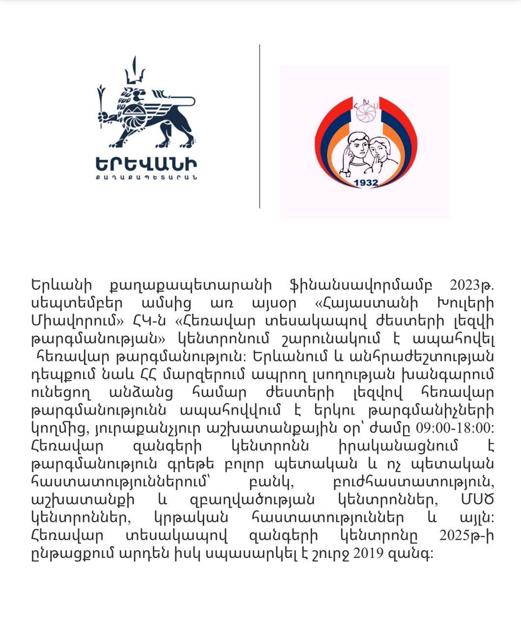 Երևանի քաղաքապետարան / Yerevan Municipality-ը Հայաստանի Խուլերի Միավորում / Armenian Deaf Association "ADA"-ի հետ համատեղ իրականացնում է «Հեռավար տեսակապով ժեստերի լեզվի թարգմանություն» զանգերի կենտրոնի աշխատանքները, որի նպատակն է ապահովել ժեստերի լեզվով հեռավ...